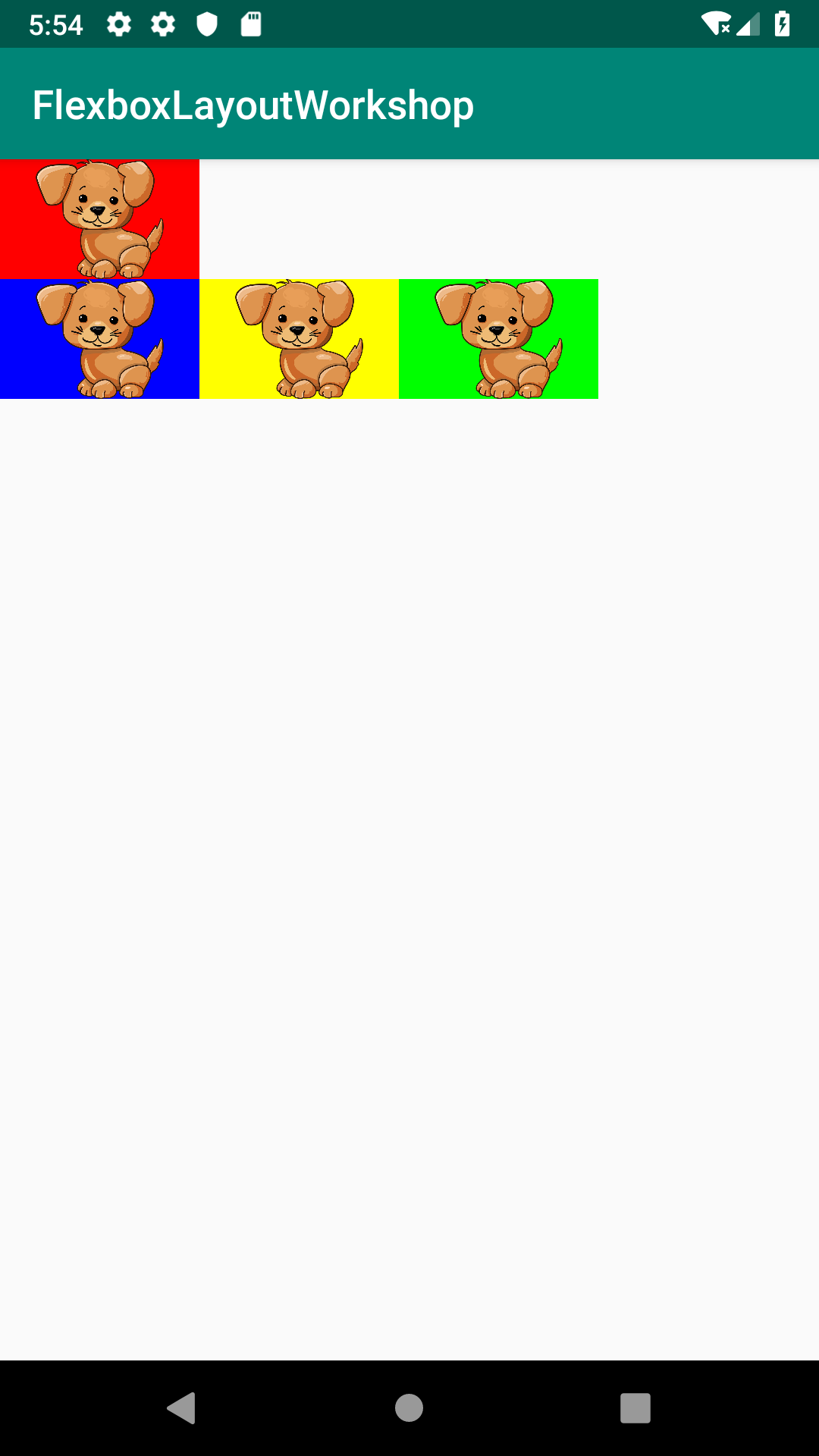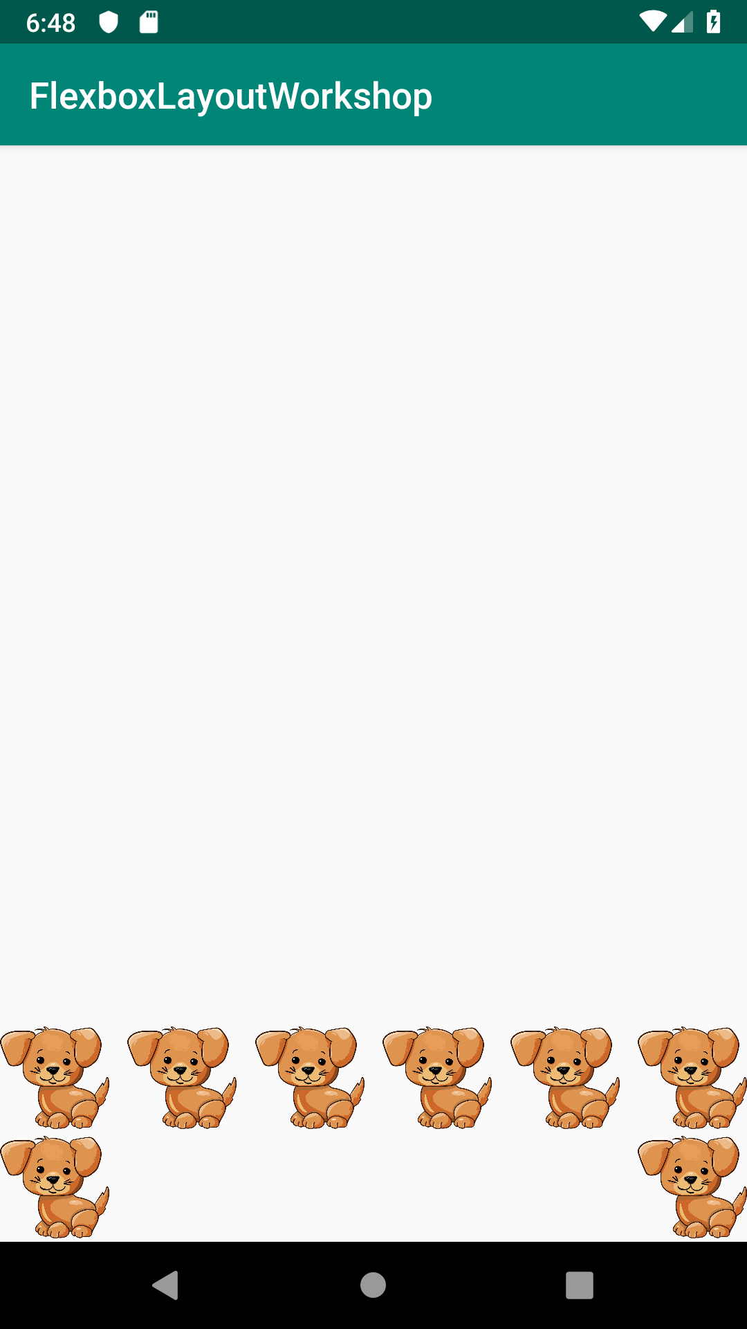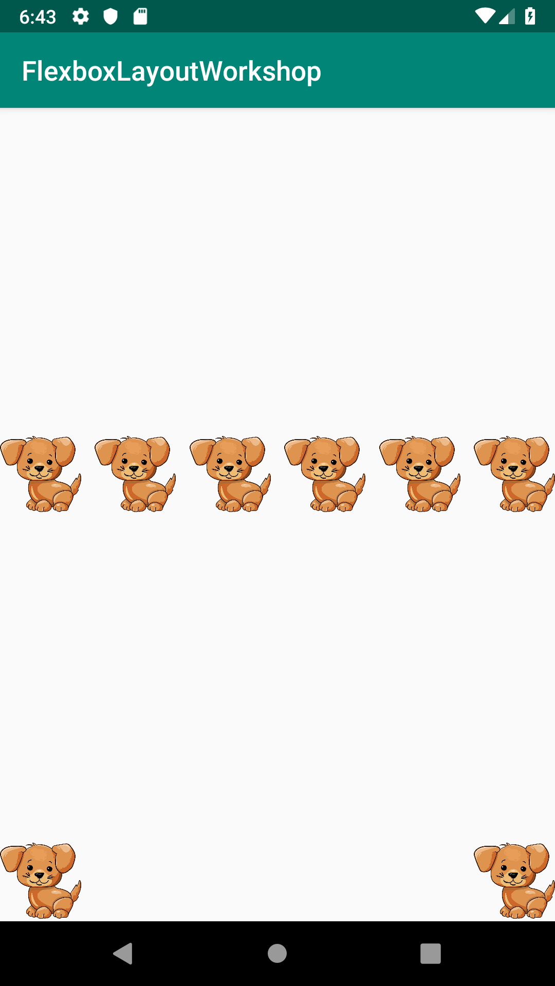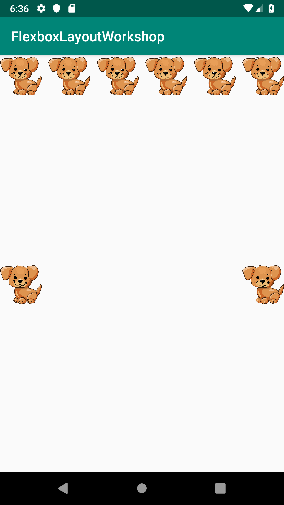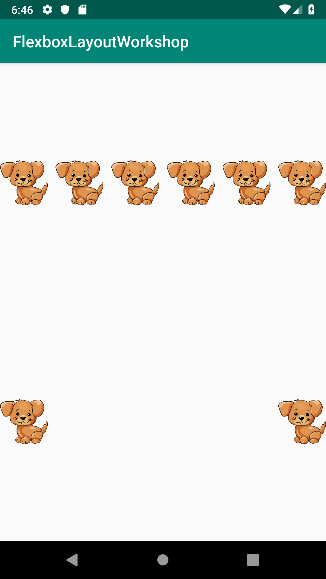 Add 3 ImageViews with a nice dog image as direct sons of the FlexboxLayout.
