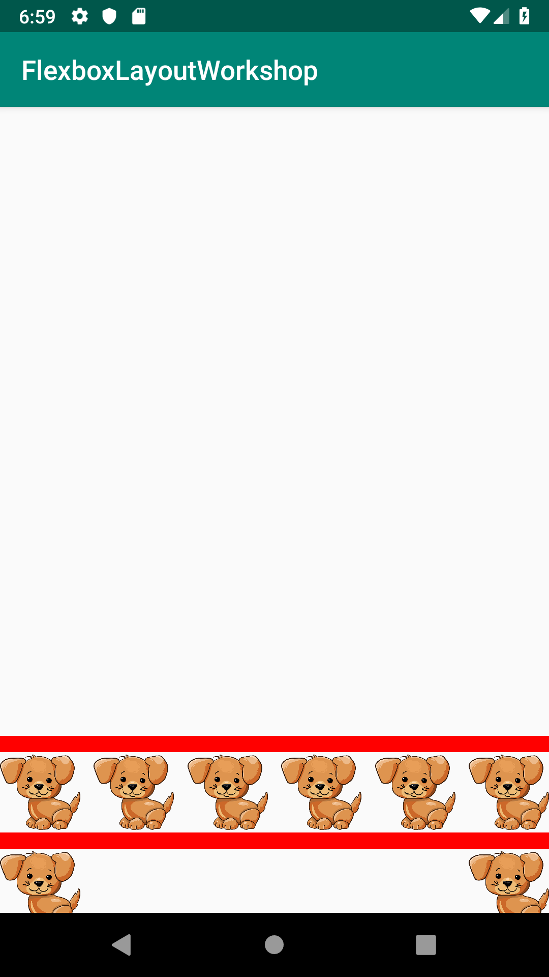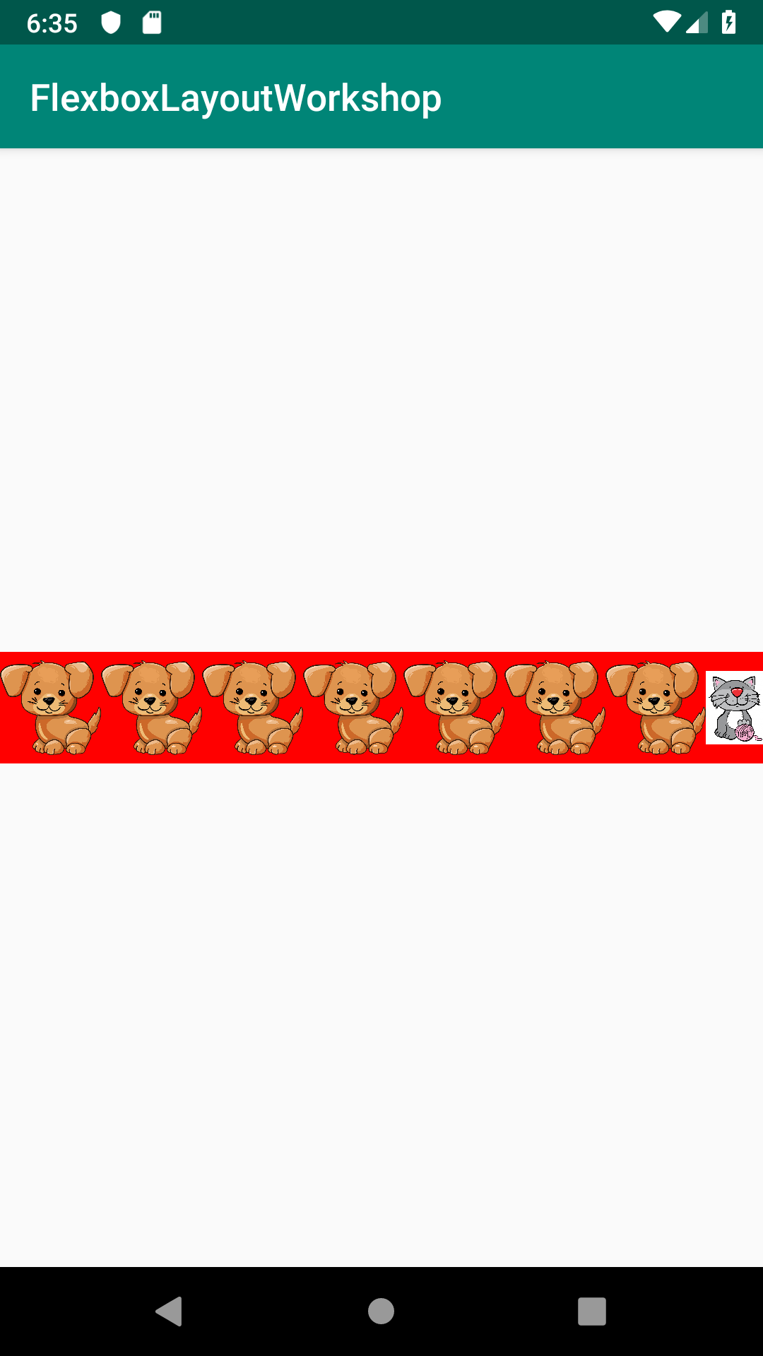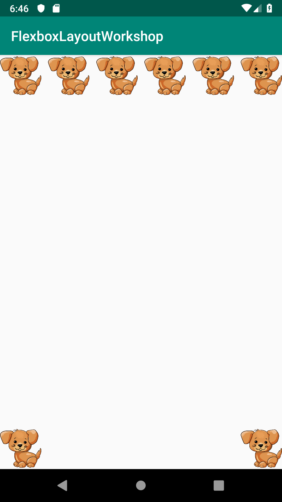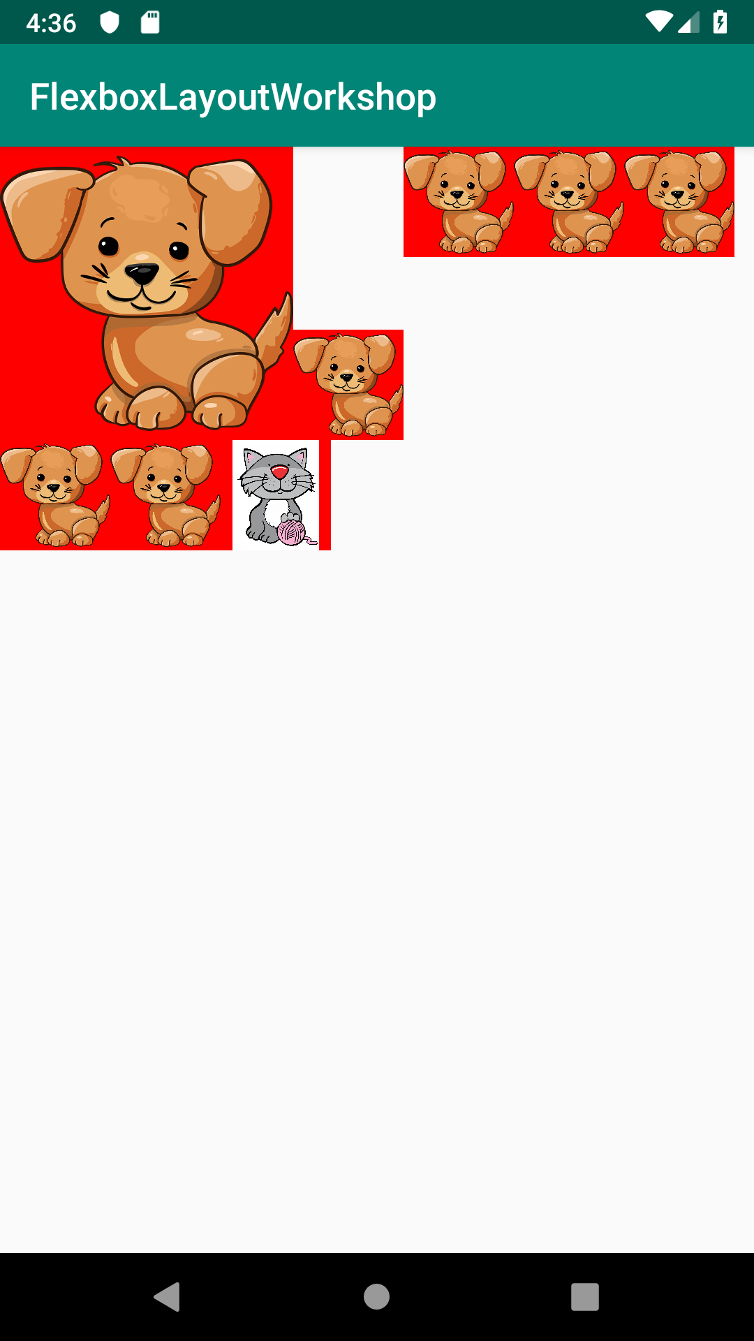 Add 3 ImageViews with a nice dog image as direct sons of the FlexboxLayout.