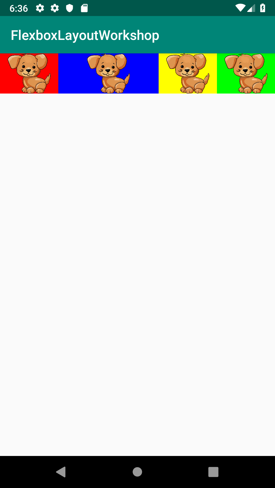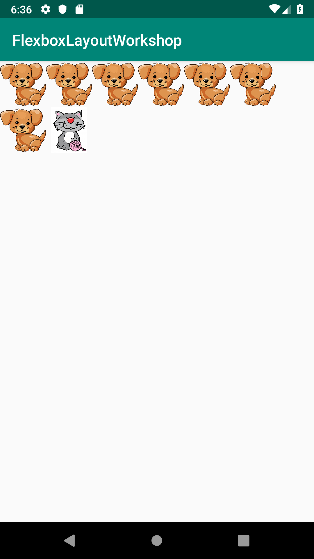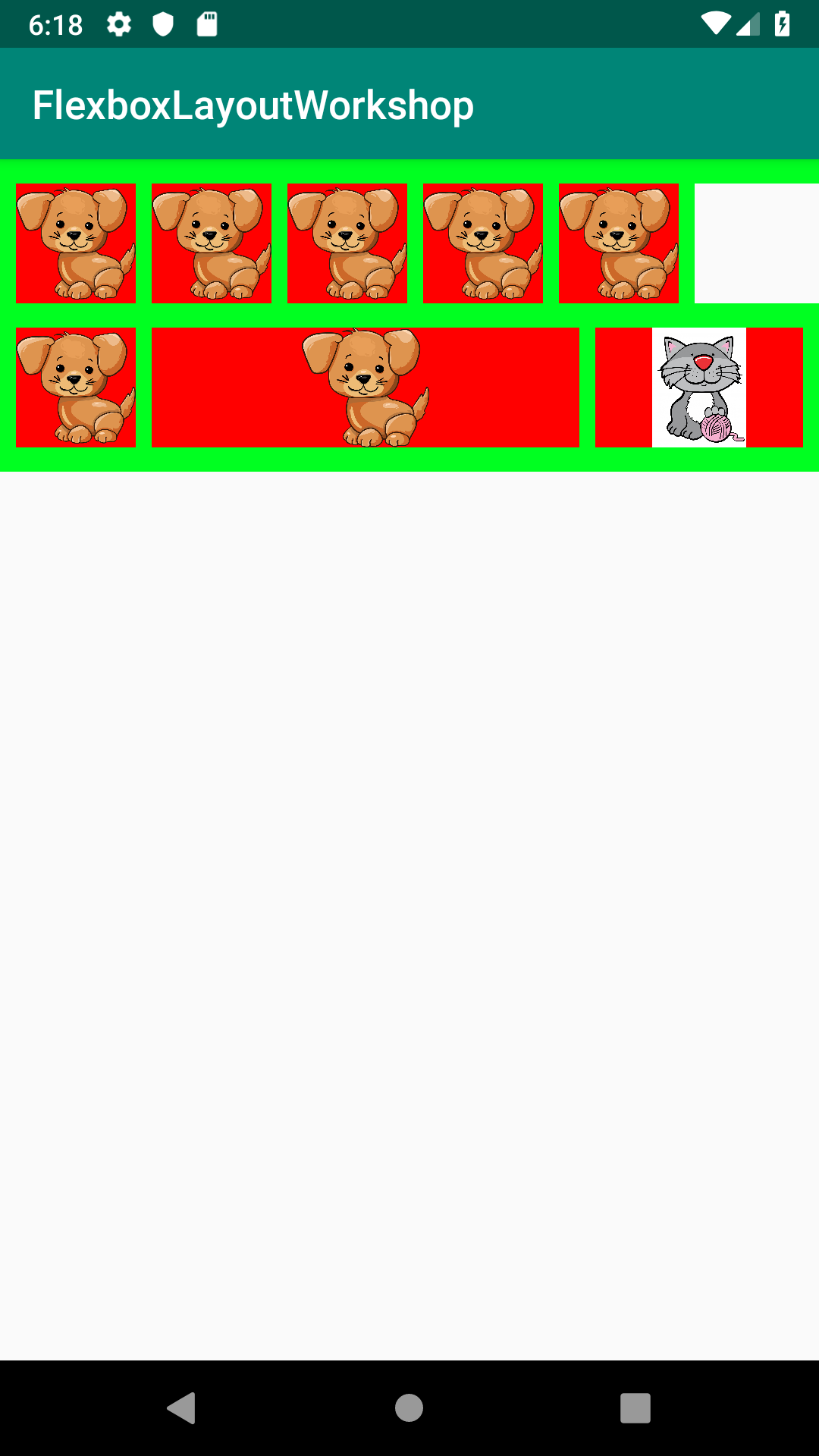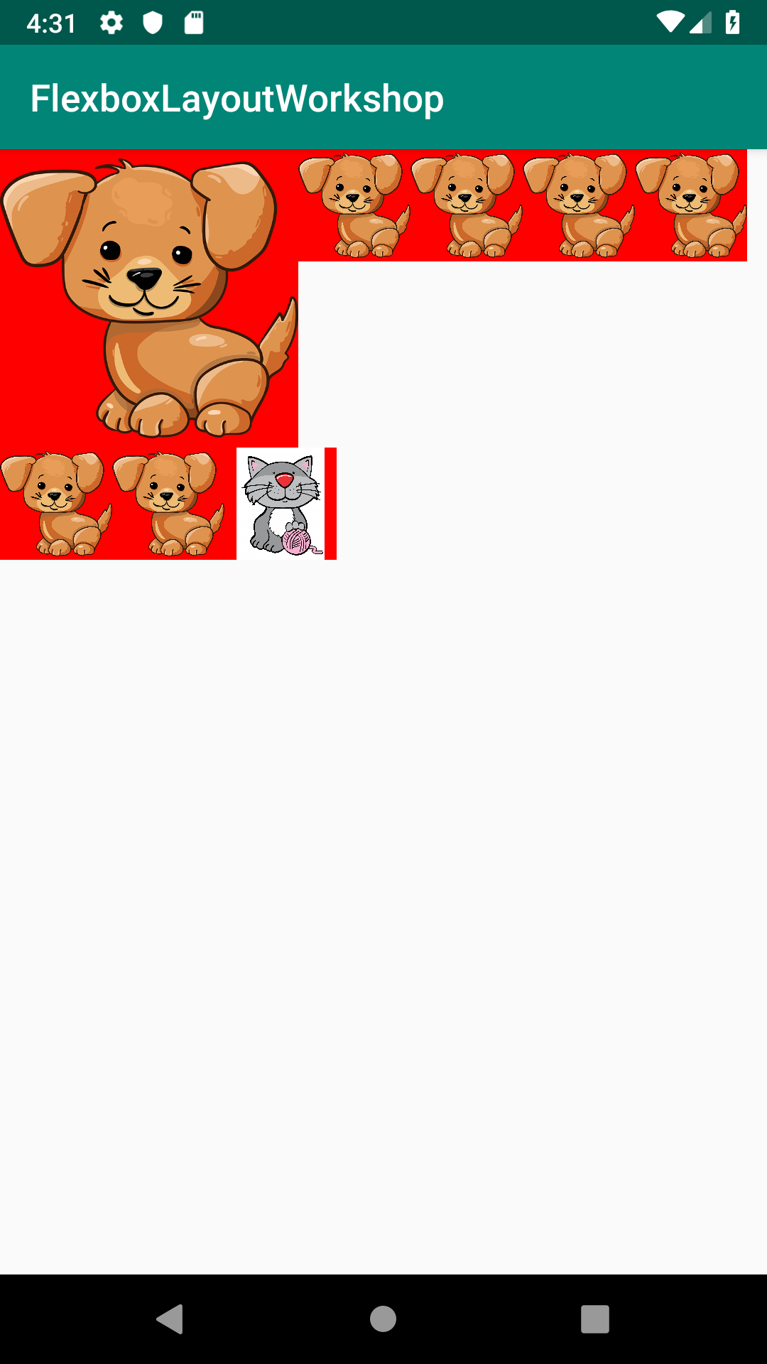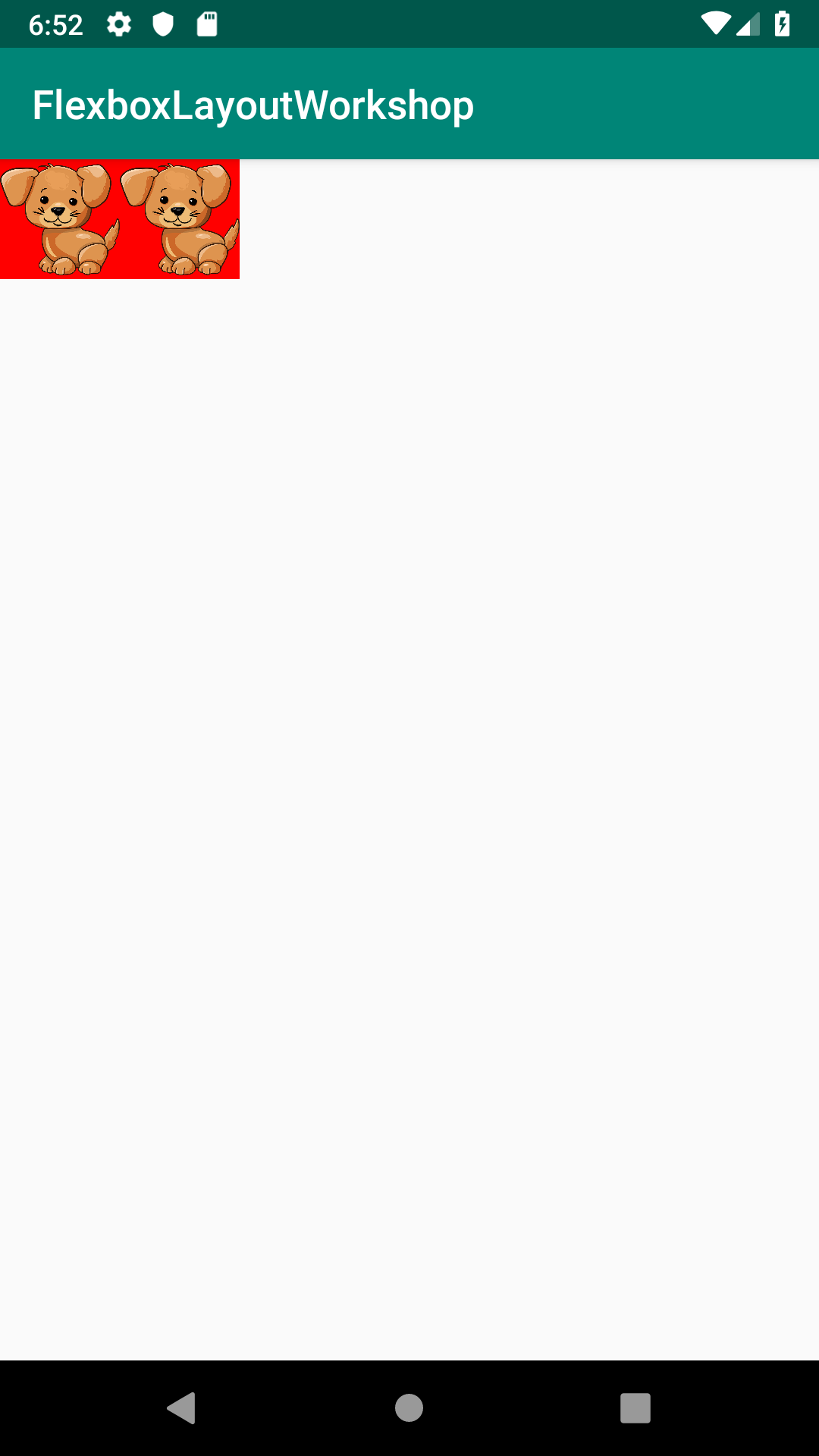 Add 3 ImageViews with a nice dog image as direct sons of the FlexboxLayout.